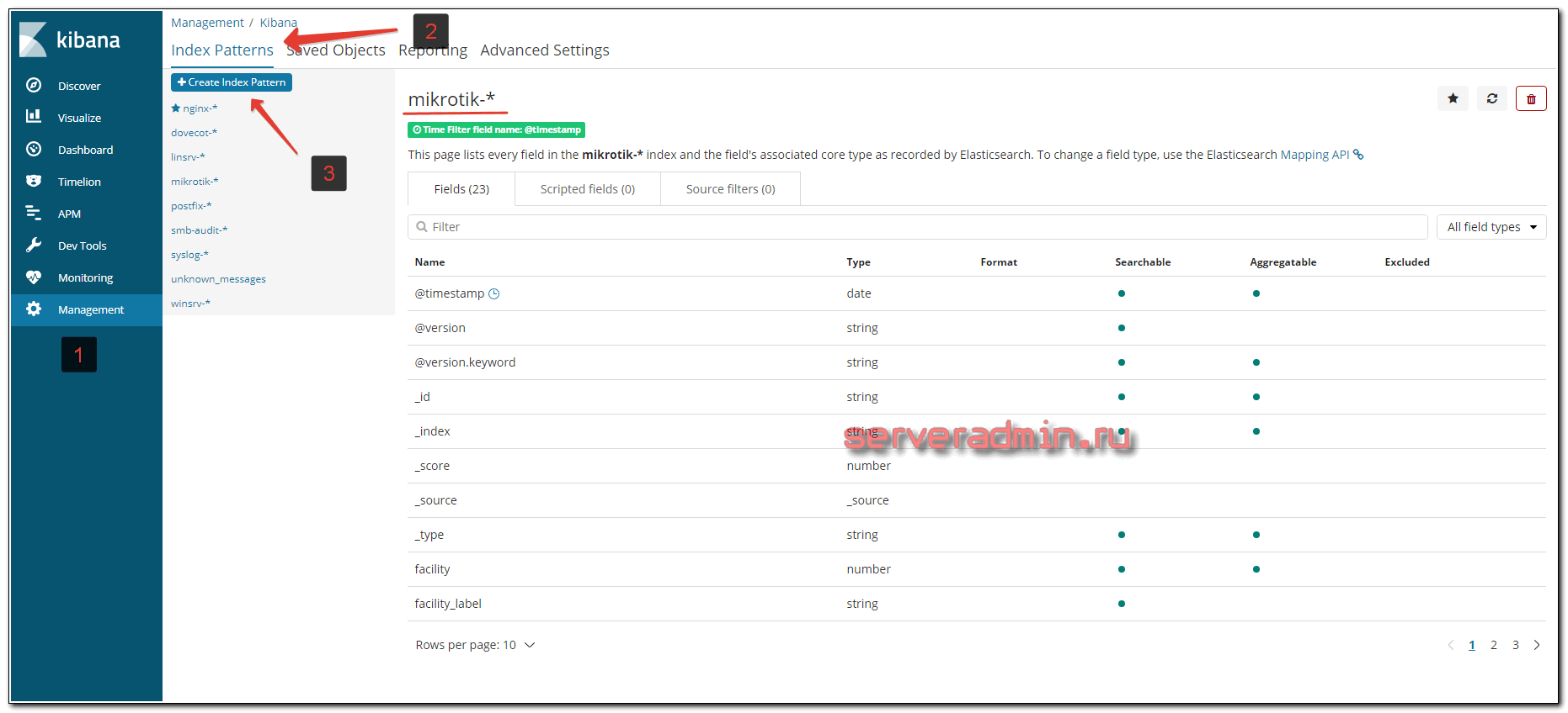 Если в предыдущих разделах вы все сделали правильно, в elasticsearch должны начать поступать данные от микротиков в индекс mikrotik-*. Идем в Kibana в раздел Management -> Index Patterns и добавляем новый индекс.