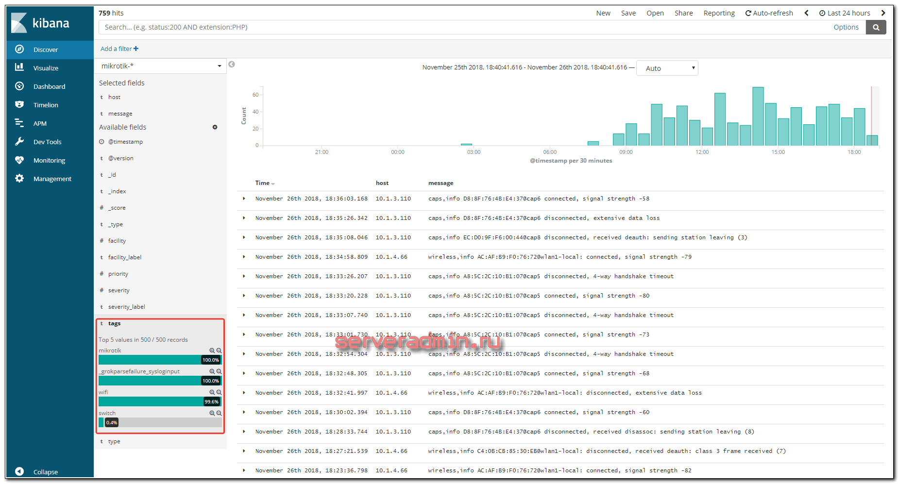 После этого можно в разделе Discover просматривать логи. При этом работает группировка по тэгам, которые характеризуют тип устройства.