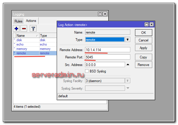 После этого идем на вкладку Rules и дублируем стандартные правила, указывая action remote или добавляем новые правила для отправки логов. Должно получиться примерно вот так: