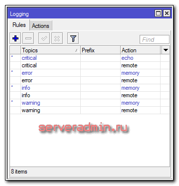 Подключаемся к Mikrotik по winbox и идем в раздел System -> Logging. Изначально там вот так, если вы ничего не меняли.