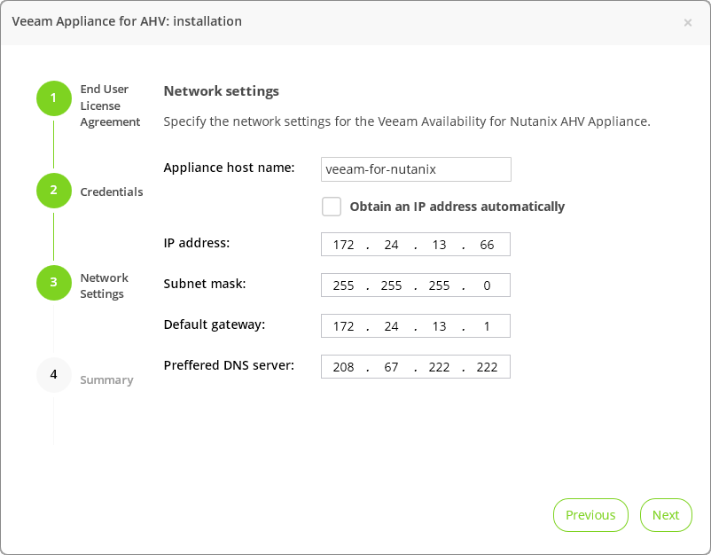 Примечание: Проверьте, что у указанного VLAN есть доступ к серверу DHCP, а также к серверу Veeam Backup & Replication и кластеру Nutanix.