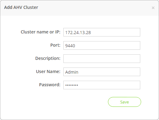 *В поле Cluster name or IP указываем IP-адрес или FQDN сервера Nutanix AHV.